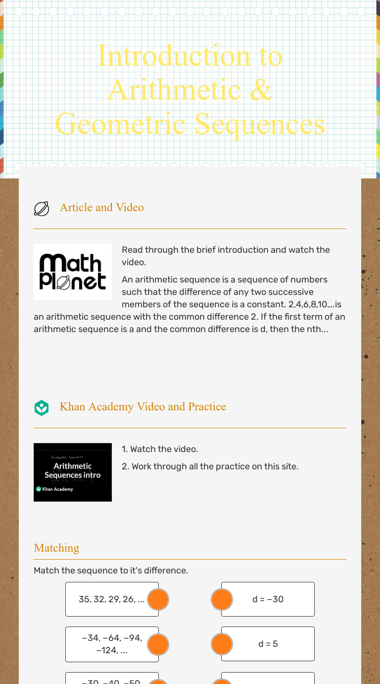 An arithmetic series is an arithmetic . Geometric sequences mathematics • 9th grade. 8 = 2 \times 4 \\ 32 = 8 \times 4 \\ 128 = 32 \times 4 \\ \text{and so on} \) To find any term in a geometric sequence . After reading this text, and/or viewing the.